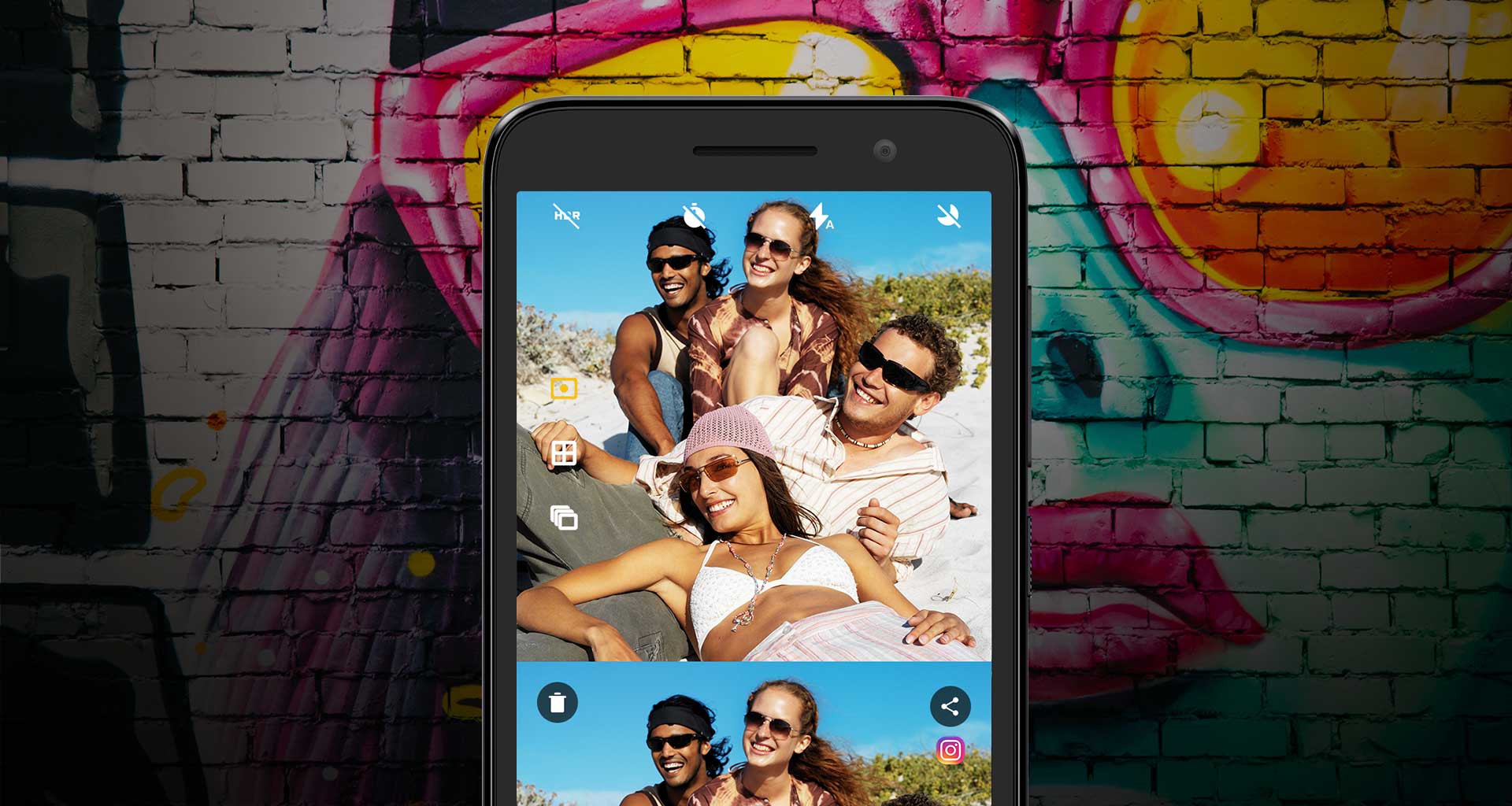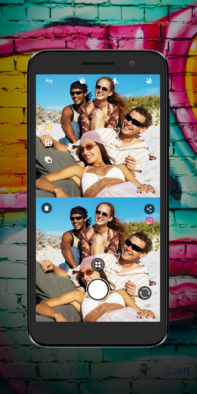 Resolution: 5MP (interp. to 8MP) Focus: Fixed Flash: LED Video capture: 1080P@30fps Features: Burst Shot, HDR, EIS, Social Square, Instant Collage, Picture Booth, Real time photo filters.